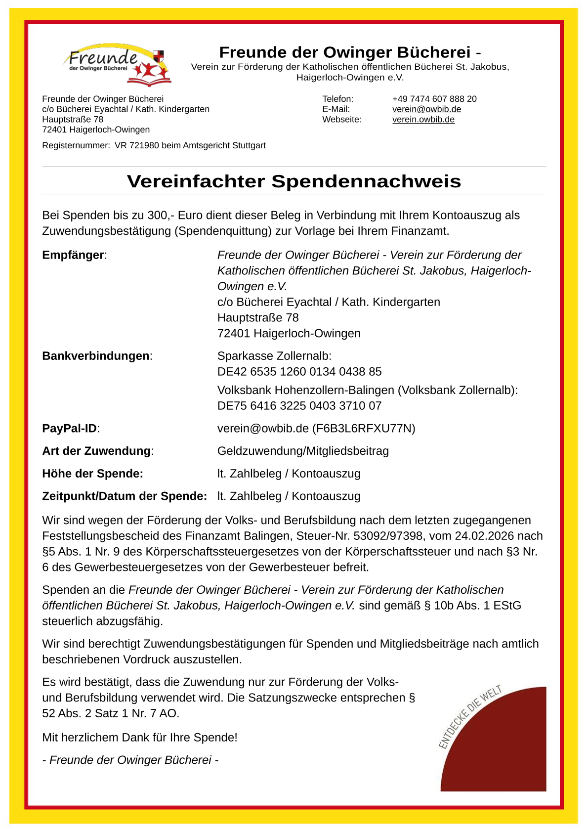Die Ausstellung und Versand der Spendenbescheinigungen für den jährlichen Mitgliedsbeitrag sowie Einzelspenden verursachen nicht unerhebliche Kosten für u.a. Druck, Porto und Umschläge. Wir geben diese lieber für die Bücherei aus. Daher: